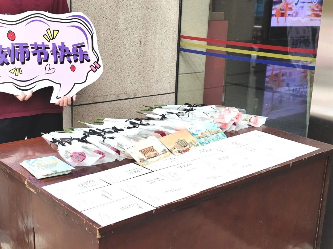 活动现场,学院学生志愿者们手捧鲜花与精心准备的手写贺卡,在摊位前,面带微笑,等待着每一位过往教师的到来。每当有教师经过,志愿者们便会上前,恭敬地献上鲜花,并递上承载着学生深情厚谊的手写贺卡,一句句“百年大计为树人,老师恩情似恩深”、“老师,教师节快乐!”温暖了每一位教师的心田。