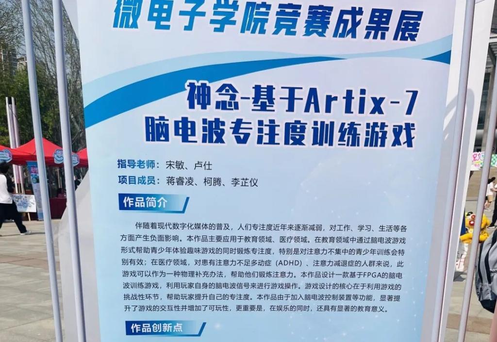 我院始终高度重视学科竞赛,积极探索与努力构建学科竞赛科学、规范、长效的工作机制。近三年学生在 “挑战杯” 全国大学生课外学术科技作品竞赛、全国大学生电子设计竞赛、全国大学生光电设计竞赛、全国大学生集成电路创新创业大赛等 A 类赛事中屡获佳绩、喜报频传。此次活动中,我院重点展示了“‘密芯轻语者’—— 基于忆阻器的低功耗安全加密芯片设计”和“‘神念’— 基于 Artix - 7 脑电波专注度训练游戏”两个项目成果。这些作品的背后,体现出我院精益求精的工匠精神以及跟进时代潮流的先进性,启蒙了同学们的科技思维及创新活力。