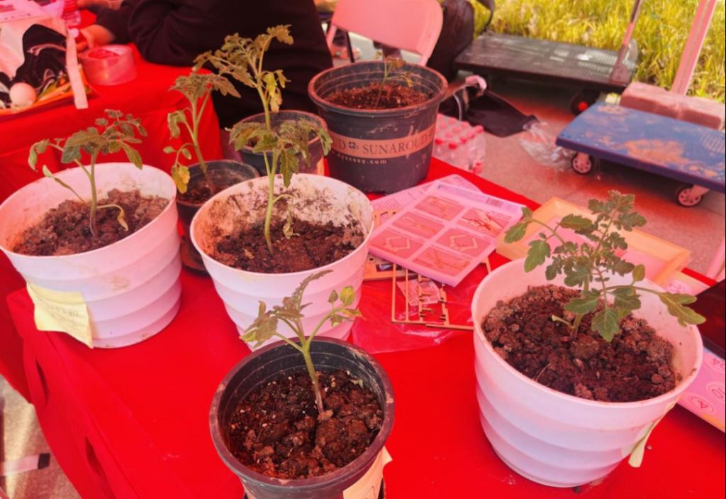 此次游园会以“芯宠辅导站”为载体,在展会上我院围绕“芯宠”——番茄,开展了系列创意趣味活动,并通过现场演示、互动体验等多种形式展示了学院创新实验室以及科创成果,为同学们带来了一场充满欢乐与温暖的心灵之旅。在活动现场,同学们展示的我院 “芯宠” 番茄植株成了众人瞩目的焦点 —— 我院独具特色的 “芯宠” 番茄植株精彩亮相。同学们将一株株亲自培育的番茄植株摆放整齐,瞬间吸引了过往师生纷纷驻足观看。茁壮的番茄不仅是学校春日里一道亮丽的风景线,而且象征着微电子学院在科学研究和技术创新上的活力和吸引力,展示着微电子相关专业莘莘学子脚踏实地、追求卓越的精神风貌。