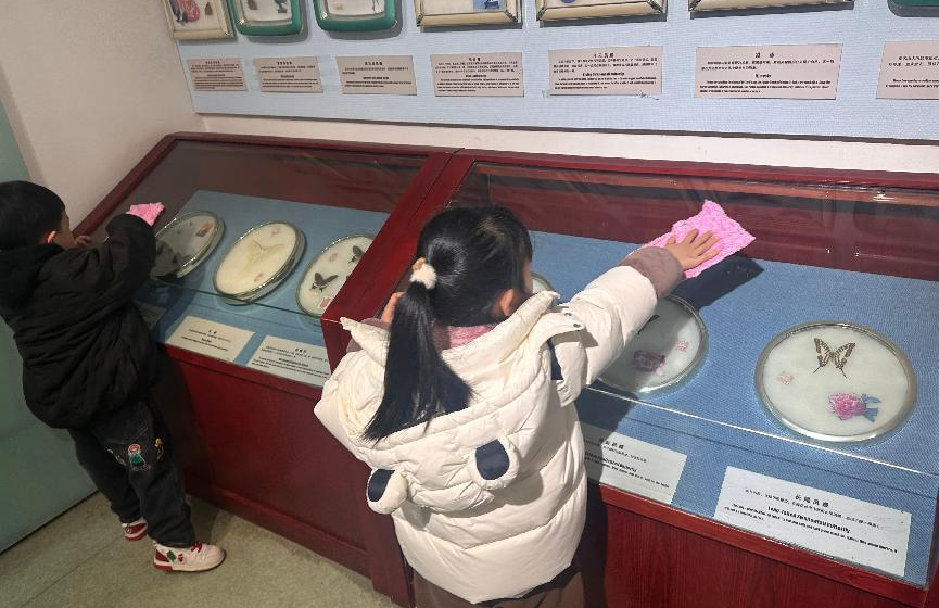 (校史馆蔡老师讲解校史、小朋友们打扫校史馆)