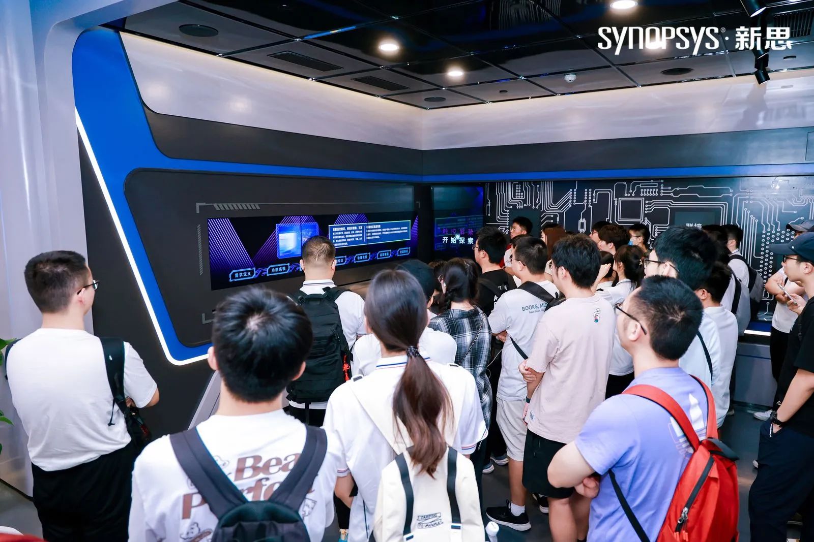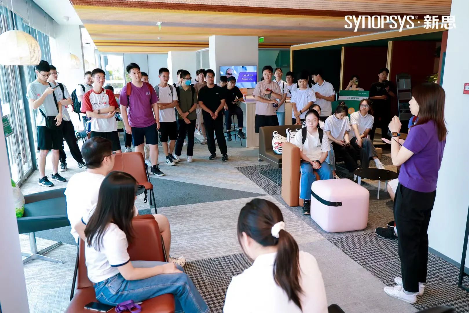 在新思科技武汉全球研发中心,实践团队在企业工作人员和吉祥物“小新”的带领下,参观了企业文化墙、时光长廊和新思科技未来馆,了解了芯片设计全链路以及各个板块之间的关联,让实践团队成员对芯片设计的过程有了深入了解,了解到了新思科技的前瞻性。