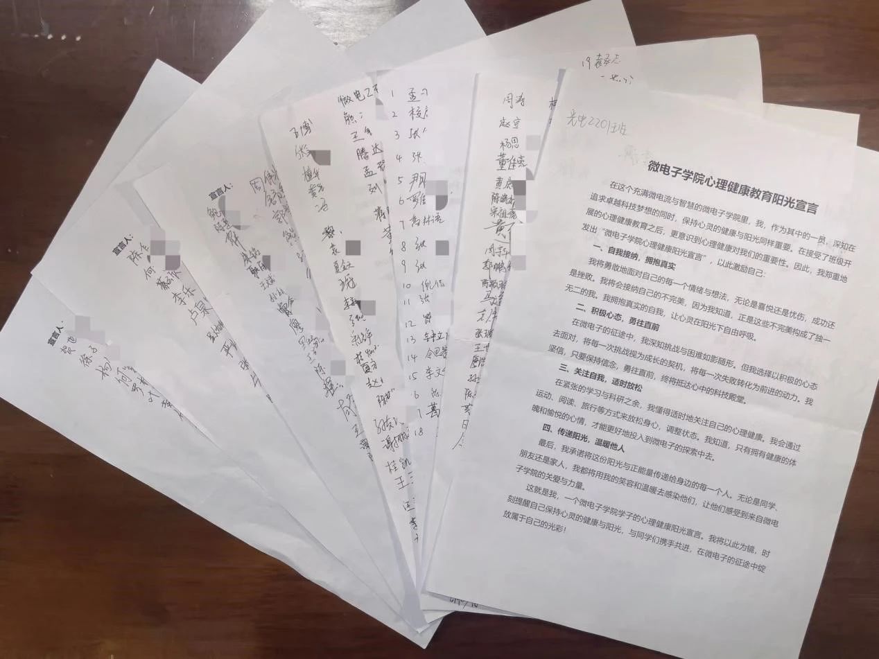 主题班会最后,为鼓励同学们接纳自我、积极向上、充分放松、传递温暖,各班组织签订了《微电子学院心理健康教育阳光宣言》,同学们认真阅读了宣言书的内容并签名。