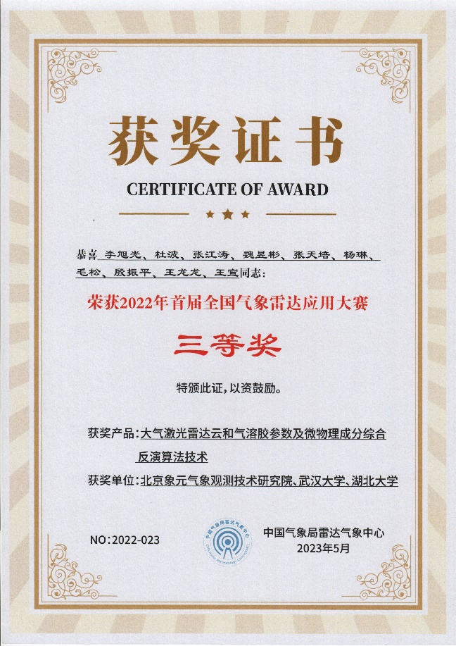 近日,首届全国气象雷达应用大赛落下帷幕。我院周一帆高级工程师指导硕士研究生张天培参与完成的技术作品“大气激光雷达云和气溶胶参数及微物理成分综合反演算法技术”荣获三等奖。