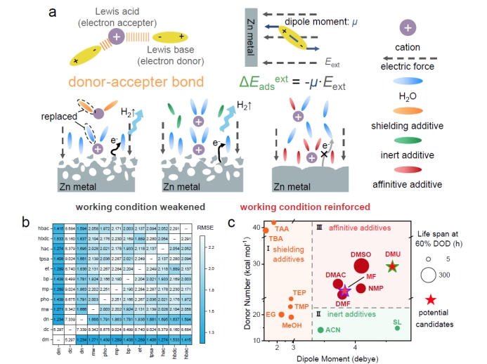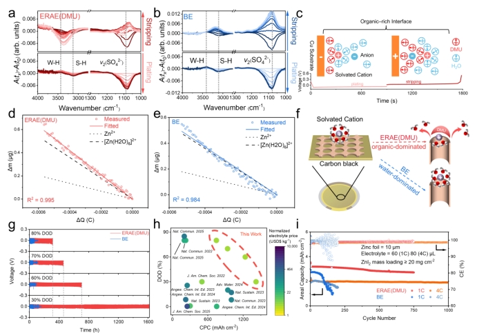本研究首次从电场驱动界面溶剂化调控的角度出发,将电极界面电场由传统电解液设计中的“被动环境”转变为可以“主动利用”的调控因素。通过引入具有电场响应能力的分子,使添加剂能够在工作电场作用下自发富集于界面并参与Zn2+溶剂化结构重构,实现对界面反应路径的动态调控。这一策略不仅突破了传统依赖高浓度电解液或大量有机共溶剂的设计思路,还为低添加量、高效率的界面调控提供了新的分子设计原则。