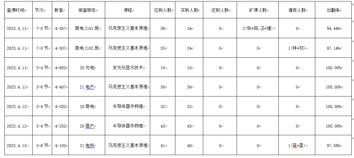为深入贯彻党的二十大精神,构建优良学风建设长效机制,督促学生树立良好学习习惯,物理学院、微电子学院学生工作办公室第十周对学院部分班级上课情况进行抽查,现将抽查情况公示如下: